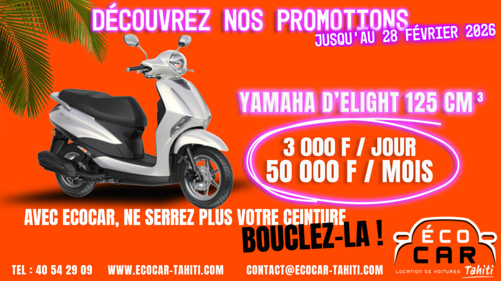 ECO CAR & Scooter Tahiti est une solution simple, flexible et économique pour se déplacer facilement partout sur l’île.